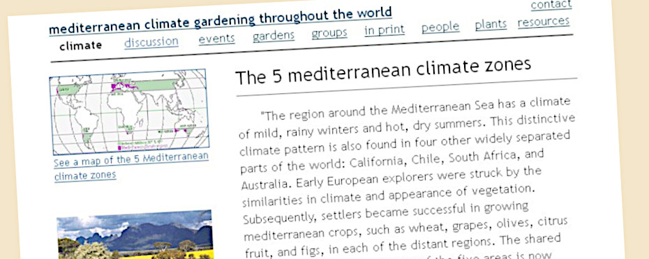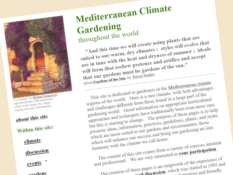 After that time, I started working on this web project with various people I had met in person years before. None of them were still local to me, but we’d been in touch via the Medit-Plants email forum. They stepped forward to participate in the mcgttw.org project. We all came to agree that the ‘mediterranean climate gardening throughout the world’ domain was cumbersome. Many ideas where floated among my new team as well as the Medit-Plants forum. Eventually we decided on ‘gardening in mediterranean climates worldwide’ (the gimcw.org domain, which was registered in 2004) even though it still didn’t easily roll off the tongue!!