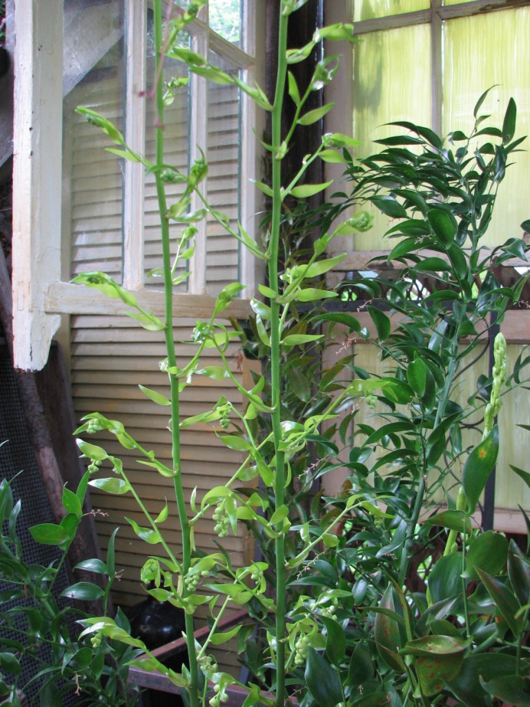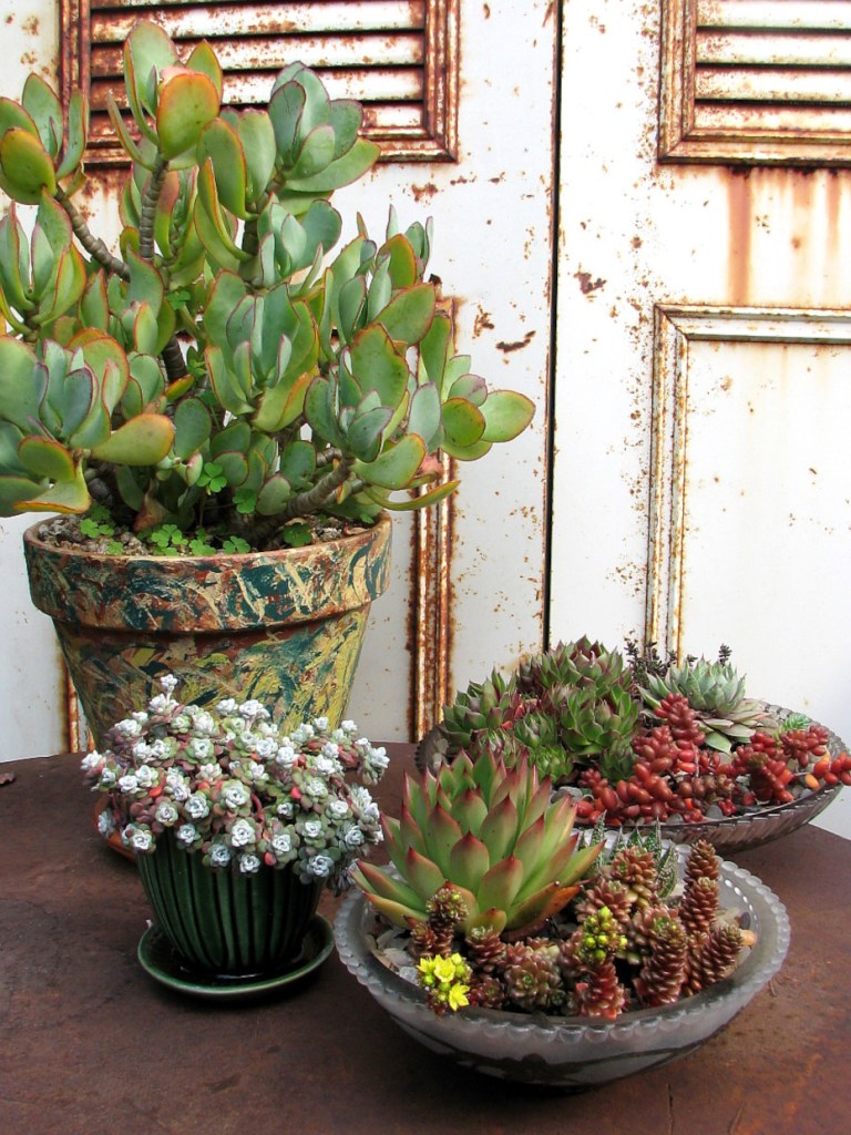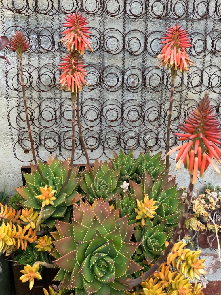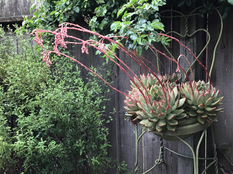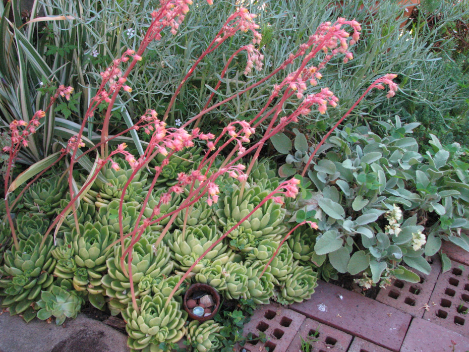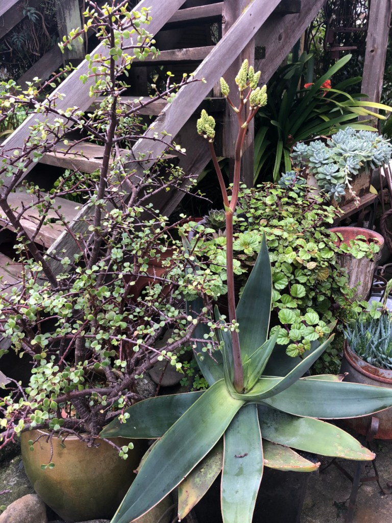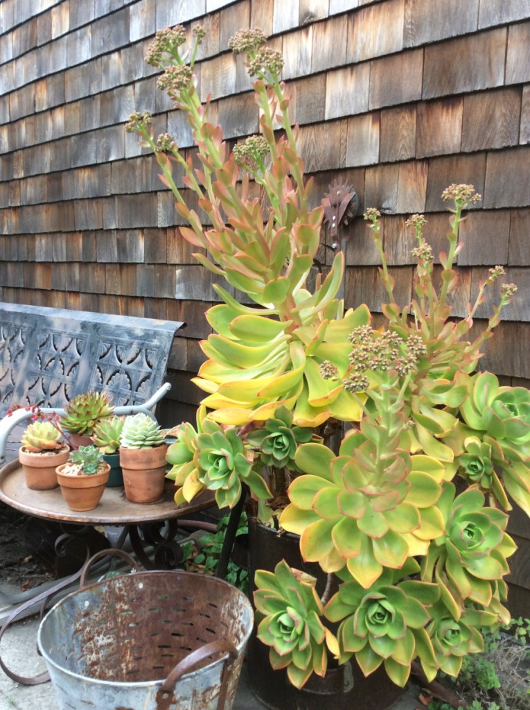 At the base of stairs to the unit above our, we arranged a number of plants in old rusted plant stands. An Aeonium nobilis hybrid that we received as a cutting from a friend grows in an unusual metal container with hand-welded handles in various places. It is obviously a hybrid because it branches readily and continued growing tall and bushy (the true A. nobilis does not branch). Eight years later, and moved to a different spot, it surprised us with a dramatic flowering! (We still grow cuttings of this unusual hybrid)