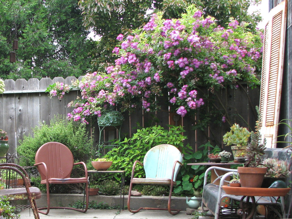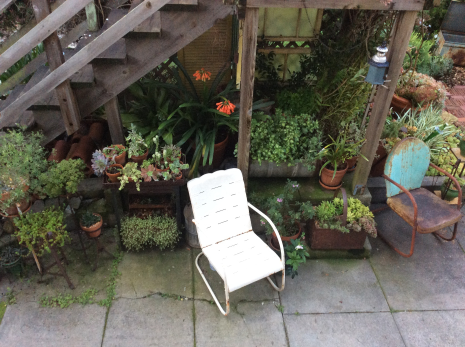 There was a sunken (one step down) space that was easy to turn into a sitting area, using vintage outdoor furniture we were already collecting. This became a personal respite from indoor life and a favorite place to entertain friends and neighbors. Surrounding this ‘room’ with our favorite plants added to the comfort and ambiance. Many of the photos I share online over the years related to this space.