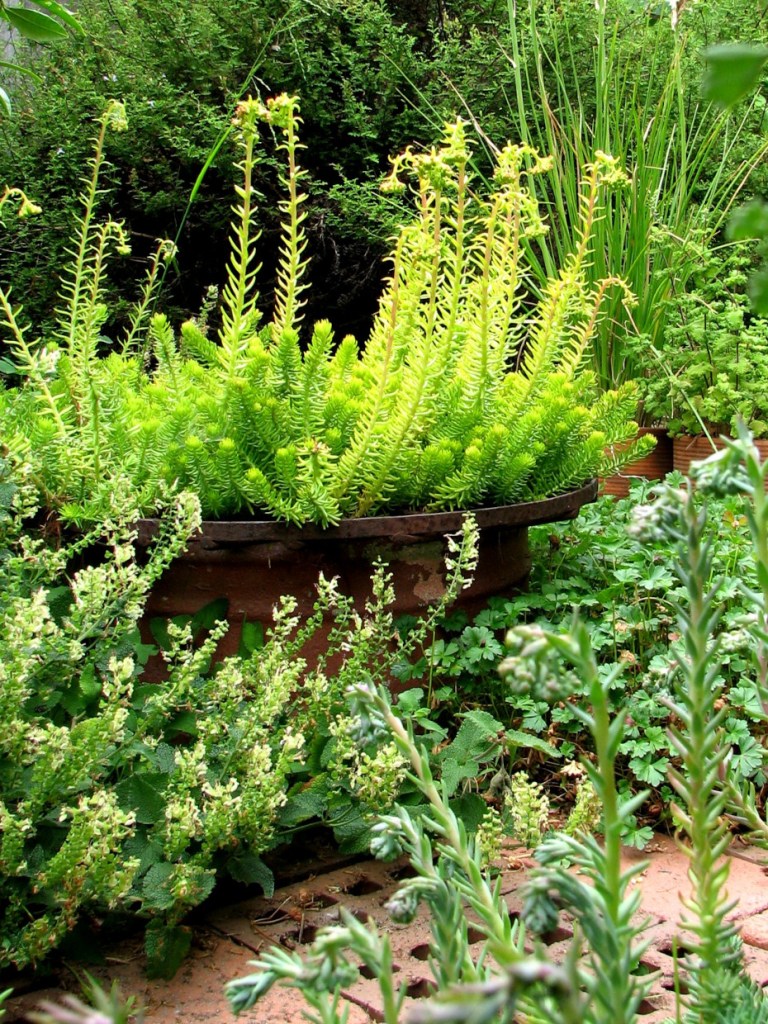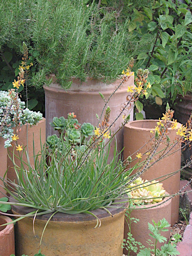 To add some variation in height to parts of the garden, we often used recycled terra-cotta tubes we sourced locally. These provided excellent drainage for certain plants that might sulk in our heavy soil, but were also excellent staging for setting off plant combinations.