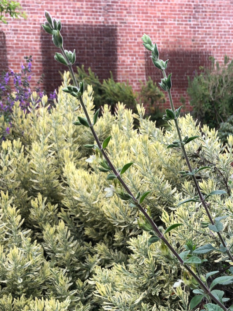 At left: The golden Sedum reflexum ‘Angelina’ flowering in a concrete tube topped with a rusty grate, joined by the flowers of Teucrium scorodonia ‘Crispum Marginatum’ (foreground left) and the flowering green form of Sedum reflexum (foreground). At right: Salvia leucantha ‘White Mischief’ flowering in from of one of the many gray leaf Centaureas I was researching.
