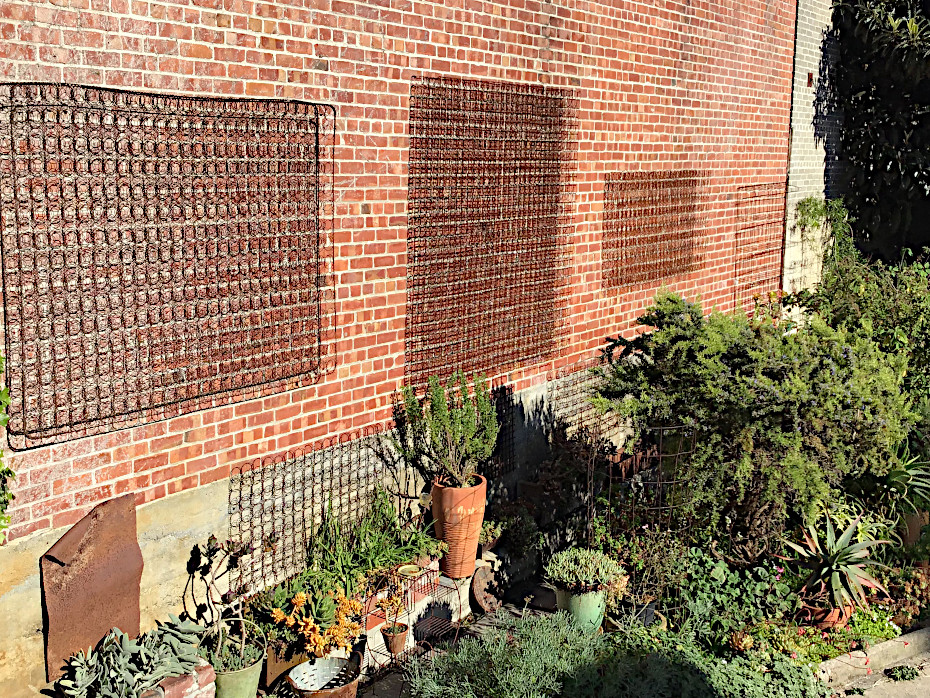 The brick wall shown in the above photo is the back side of a neighboring building. Its tall and stark presence was hard to ignore. Eventually we got the idea to hang a rusty mattress spring for some visual interest. In a college town, abandoned mattresses are common during student move-out, so it was easy to collect a few more in different sizes …