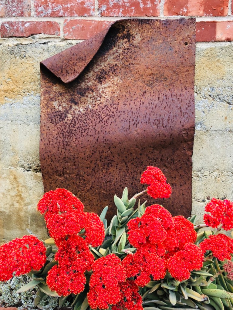 Other found rusty items were also displayed along the base of this wall. One of our favorites, found along some nearby railroad tracks, was this bent iron cover of some sort, with a charmingly bent corner.