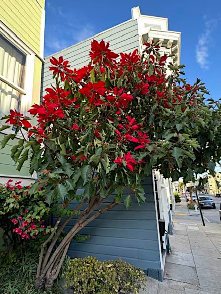 At this time, the mass production of potted poinsettias was not so ubiquitous in our part of California as it is today. The garden specimens seemed to have been planted by Mexican families (whose families may have been here since before California became part of the US) or immigrants from Central America, where the plant is also native.