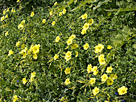 Growing up in the San Francisco Bay Area, ‘sourgrass’ was part of my childhood. The stems of O. pes-caprae delighted me and other children in their decidedly sour taste (oxalic acid) and we used to much on them when found growing in agricultural fields (which surrounded us) or in local gardens. They were present but not particularly weedy at that time (the 1950-60s).