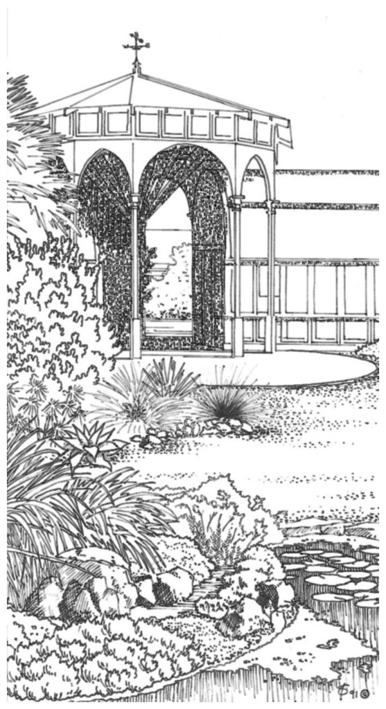In early 1990, access to the garden was via the driveway to the house on the north side of the property. We would park by the two shade houses and enter through the ‘Ruth’s Folly’. Its significant presence in the garden, it seemed by all accounts, appropriate to use for the original logo design.